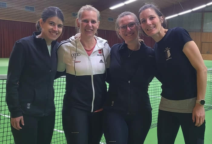 Unsere Damenmannschaft, die erstmals an der Winterhallenrunde des BTV teilnimmt, hatte zum Auftakt einen schweren Stand gegen die stark aufgestellte zweite Mannschaft des TSV Rohr, die an Position eins bis drei fünf Leistungsklassen besser eingestuft war und diese Vorteile auch konsequent in Siege umsetzen konnten. Lediglich Carina Glatter konnte im Spitzeneinzel den ersten Satz ausgeglichen gestalten und musste sich nach der Niederlage im Tiebreak im zweiten Durchgang glatt mit 6:0 geschlagen geben. Katja Mader gegen Ida Winkler und Thea Egerer gegen Jule Schumann waren jeweils chancenlos und unterlagen ganz glatt in zwei Sätzen. Erfreulich war der Sieg unserer Nachwuchsspielerin Lisa Schmidt (ein Bild aus der Sommerrunde), die ihre Begegnung nach starkem Spiel sicher mit 6:1 und 6:3 für sich entschied und damit auf 3:1 verkürzte. In den anschließenden Doppeln waren die Chancen auf ein Unentschieden äußerst gering. Der Sieg ihres 1er-Doppels gegen Thea Egerer und Katja Mader (im Bild vorne von rechts) war erwartet worden und fiel mit 6:0 und 6:1 aber etwas zu deutlich aus. Unser 2er-Doppel mit Lisa Schmidt und Carina Glatter (im Bild vorne von links) wuchs über sich hinaus und gewann nach einem überraschend klaren 6:0 Sieg im ersten Satz und einer knappen 7:5 Niederlage im zweiten Durchgang den hart umkämpften Match-Tiebreak umjubelt mit 10:7, was letztendlich die 4:2 Niederlage bedeutete.