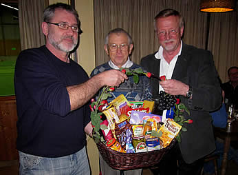 Bild: 3.Vorsitzender Thomas Oppel (links) und Abteilungsleiter Helmut Peschke (rechts) beim Überreichen eines Geschenkkorbes an den ausscheidenden Platzwart Willi Höft als Aner kennung für 16 Jahre lange hervorragende Arbeit im Verein.