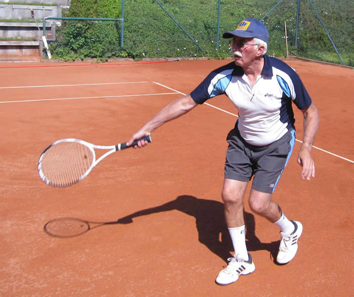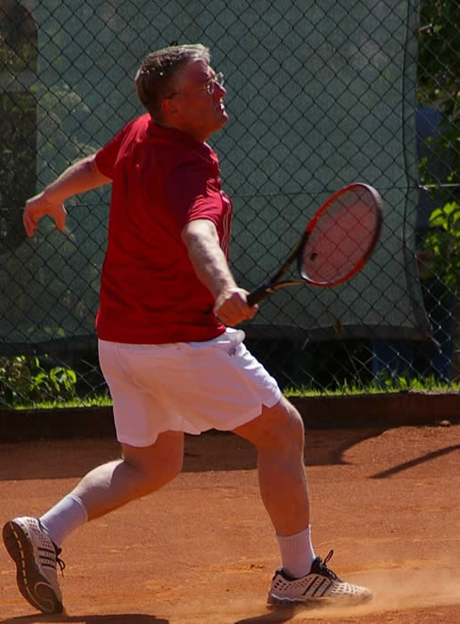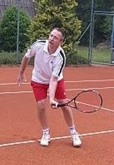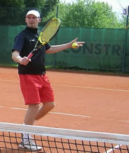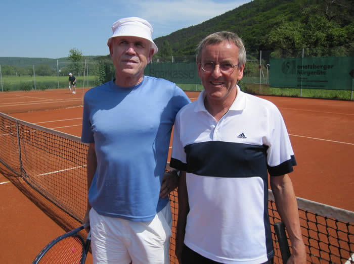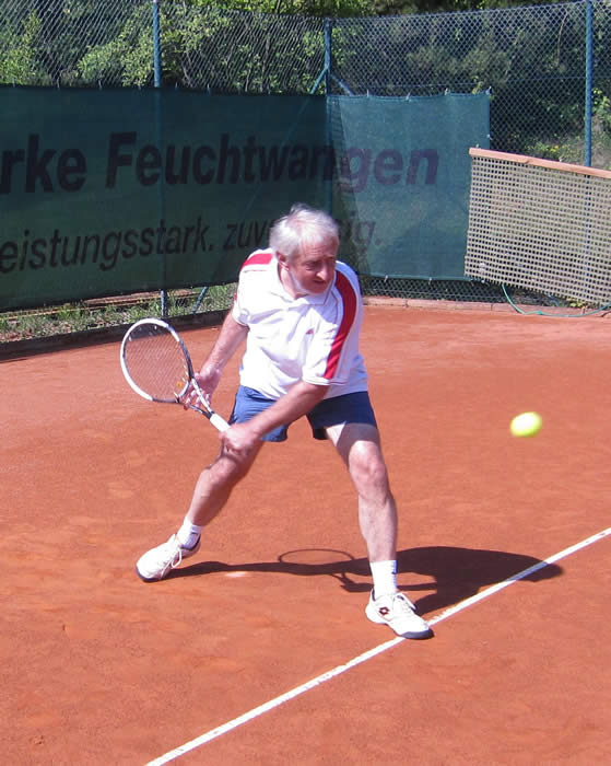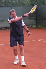 Die Gäste gingen überraschend schnell mit 2:0 in Führung, nachdem Matthias Gräbner im Spitzenspiel mit 6:1 und 6:2 klar und Hans-Martin Bachmann hartumkämpft und etwas unglücklich mit 6:2 und 7:6 unterlagen. Doch dann hatten die Gäste ihr Pulver verschossen. Johann Ederle (Bild rechts) verkürzte mit einer soliden Leistung (6:3,6:1) zunächst auf 2:1. Dr. Klaus-Uwe Wolf (Bild links), 6:1,6:0), Volker Egerer (6:1,6:1) und Frank Pötzl (6:0,6:0) spielten anschließend groß auf und brachten den TuS mit 4:2 in Führung. Auch in den Doppeln dominierten unsere