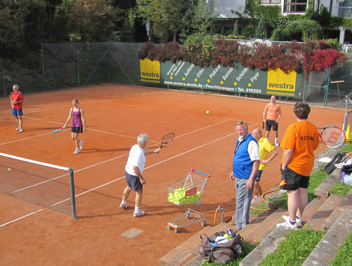 Die Partie des Tages spielte Markus Pflanz, der nach 6:4 und 1:6 im Super-Tiebreak schon mit 9:3 gegen Michael Beck zurücklag und noch vielumjubelt mit 11:9 siegte. Das Spitzendoppel mit Konrad Pflanz und Hans-Martin Bachmann siegte ebenso glatt wie das 2er Doppel Markus Pflanz mit Jan Bischoff. Kai Bischoff und Christian Wiesinger machten es hingegen spannend, behielten aber mit 7:6 und 6:4 gegen Harald Vestner und Alexander Zahner die Oberhand. |