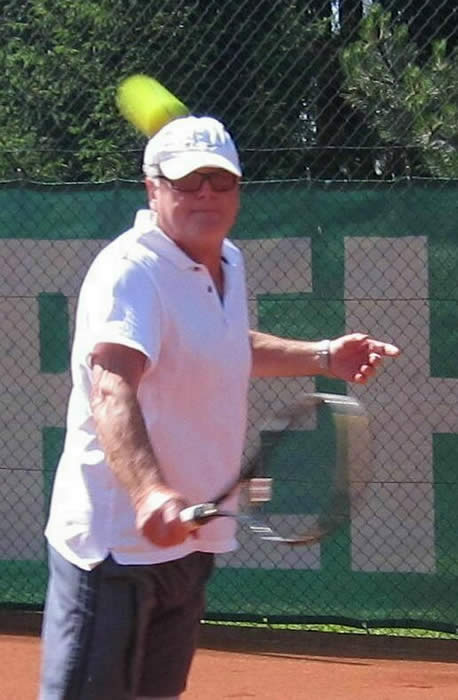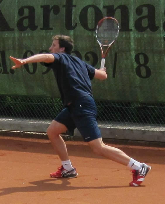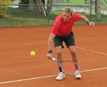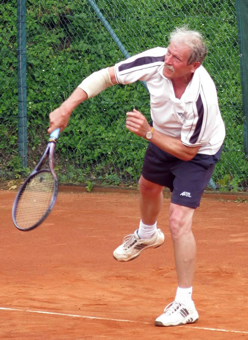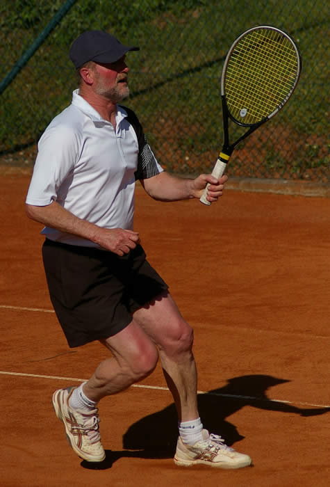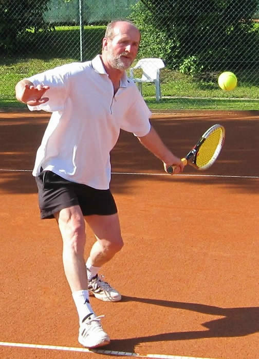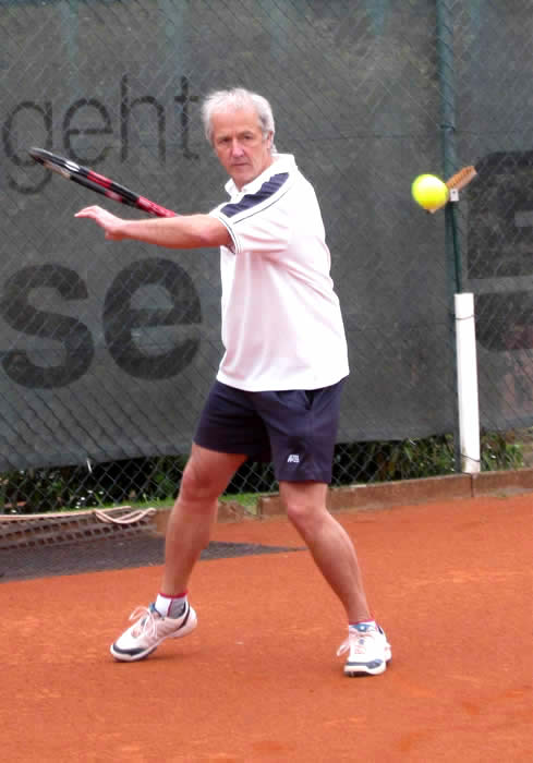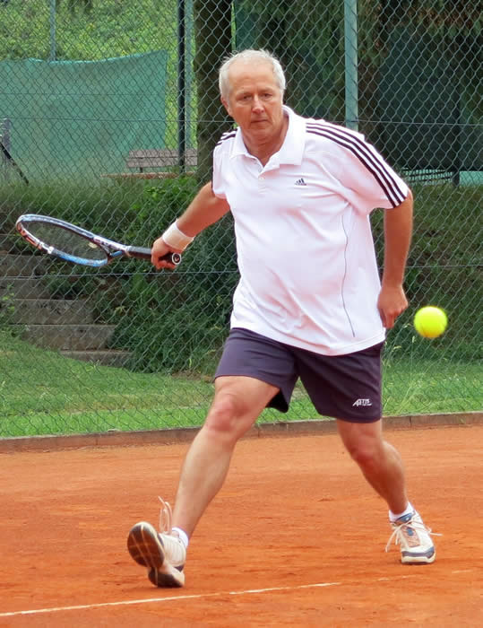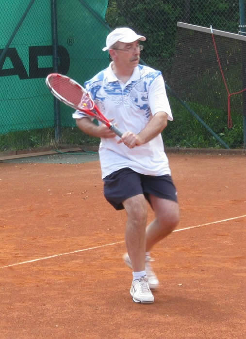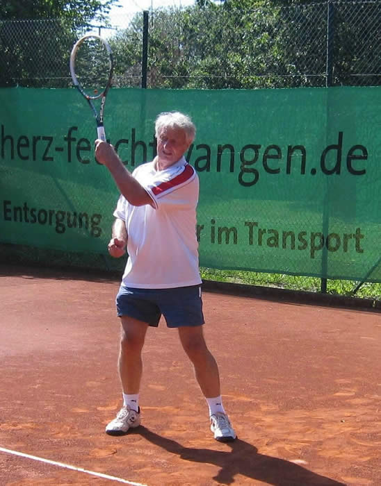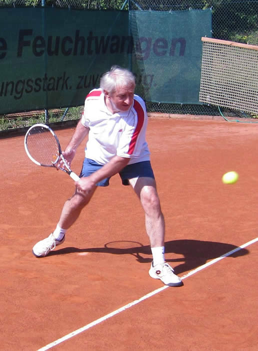 Gegen den spielstarken Meisterschaftsfavoriten hätten die Kreuzgangstädter mit etwas Glück für eine Überraschung sorgen können. Spielentscheidend war wohl die Niederlage des von Beginn an stark aufspielenden Konrad Pflanz gegen Johann Dietsch. Den Sieg schon vor Augen, schlichen sich einige leichte Fehler ein, die ihm den 2.Satz und den Super-Tiebreak kosteten. Weder Rainer Treu, der nach langer Verletzungspause wieder in das Spielgeschehen eingriff und die Partie mit gutem Tennis über weite Strecken ausgeglichen gestaltete, noch Heinrich Wild, der von Anfang an nicht zu seinem Spiel fand, konnten für den TuS punkten. Auch das Spitzeneinzel entschieden die Kitzinger erwartungsgemäß für sich, obwohl Dr. Wolfgang Kelm dem wohl stärksten Spieler dieser Liga im ersten Satz lange Zeit Paroli bieten konnte. Die beiden Einzelpunkte für den TuS holten in der zweiten Spielrunde Helmut Peschke und Erwin Krommer (Bild), die sehr konzentriert spielten und in überzeugender Manier gewannen. Die Umstellung der Doppel brachte den Feuchtwangern letztendlich keinen Erfolg. Lediglich dem nahezu fehlerfrei agierenden 2er-Doppel Dr. Kelm/ Krommer gelang ein Sieg.