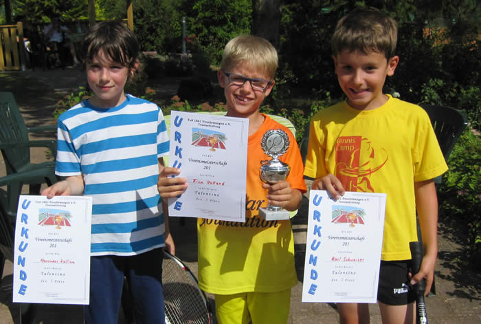 Begeistert waren die Eltern und Zuschauer vom jüngsten Tennisnachwuchs, den „Talentinos“, die großen Einsatz zeigten und bewundernswerte Ballwechsel zustande brachten. Hier siegte Finn Volland mit der besten Punktebilanz und verwies Karl Schweizer und Alexander Kallina auf die weiteren Plätze. Bei den Bambinis holte Florian Gemein seinen ersten Titel mit einem Erfolg gegen den aufopfernd kämpfenden Florian Binder. Den 3.Platz belegte Noah Haas. Bei den Juniorinnen präsentierte sich Christina Wolf erneut in Bestform und bezwang im Finale ihre Schwester Rebecca. Dritte wurden Denise Buricescu und Ann-Katrin Lehner. Der Juniorentitel ging ohne Spiel an Moritz Wolfram. Vizemeister wurde Nick Knirsch vor Daniel Klein, der im Spiel um Platz drei gegen Alex Breitinger erfolgreich war.