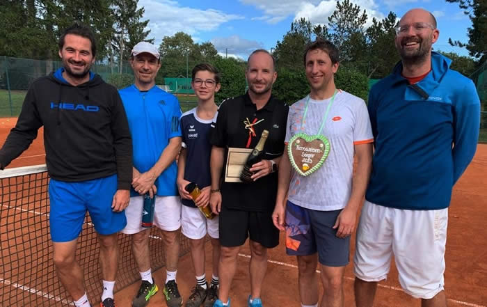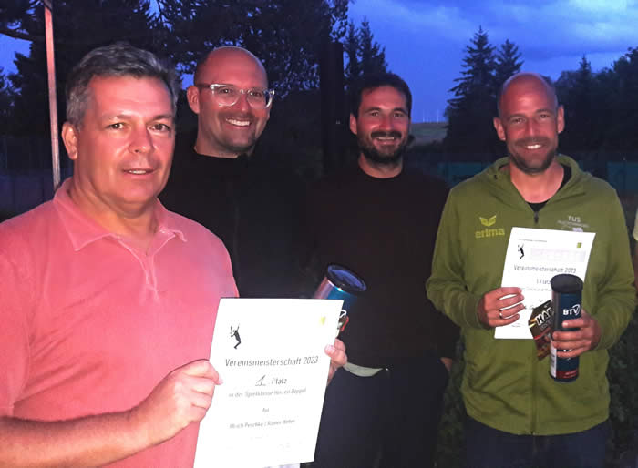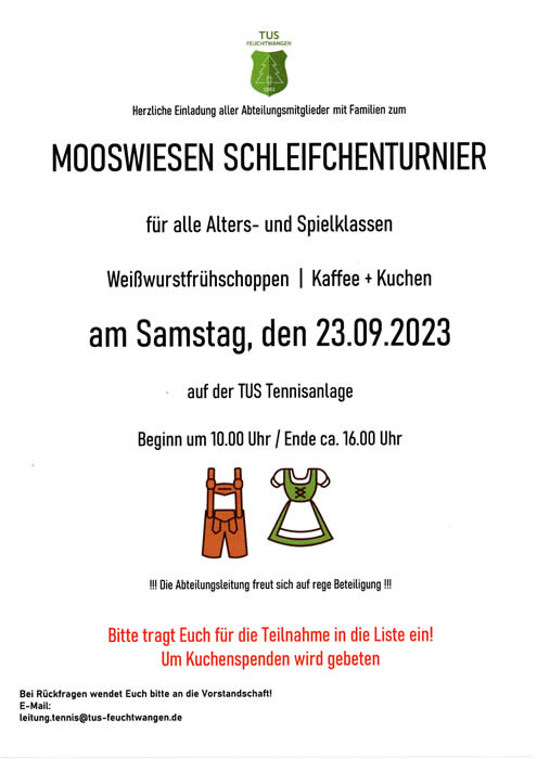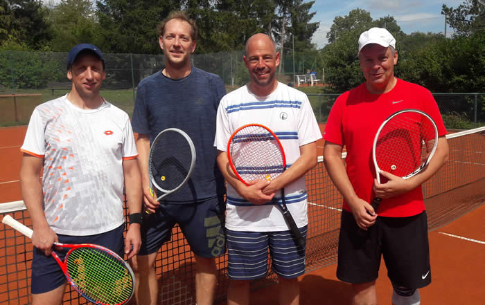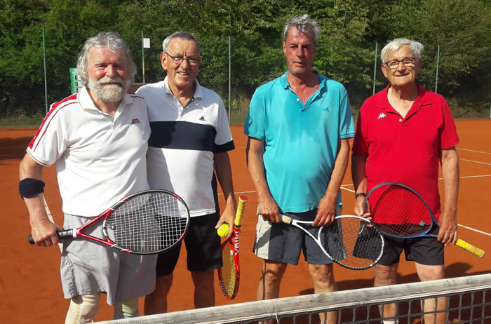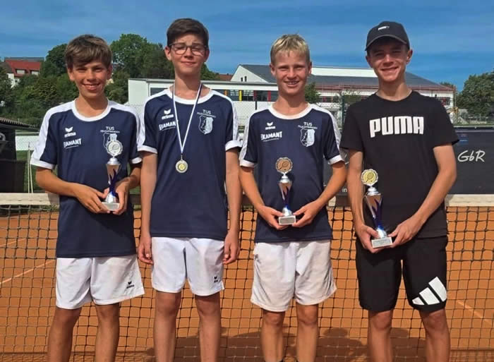 Die 56.Auflage des traditionellen Mooswiesen-Schleifchenturniers der TuS-Tennisabteilung gewann bei idealem Tenniswetter und guter Beteiligung Daniel Rudek (im Bild Zweiter von rechts), der im Finale den wieder ins aktive Tennisspiel eingreifenden Daniel Czekaj ( im Bild Dritter von rechts) nach starkem Spiel bezwang. Den dritten Platz belegten gemeinsam Johann Ederle und August Winter (im Bild 2. und 3. von links). Der Spielmodus des Schleifchenturniers sieht vor, dass die Teilnehmer zunächst in verschiedenen Wettbewerben gegeneinander antreten und bei einem Sieg bunte Schleifchen erhalten. Wer die meisten Schleifchen erspielt hat ist dann aber noch nicht automatisch Mooswiesensieger. Vielmehr werden in einem Rundlaufspiel die von den Teilnehmern gewonnenen Schleifchen solange verspielt bis am Ende noch vier Spieler übrig bleiben, die dann den Sieg unter sich ausmachen.