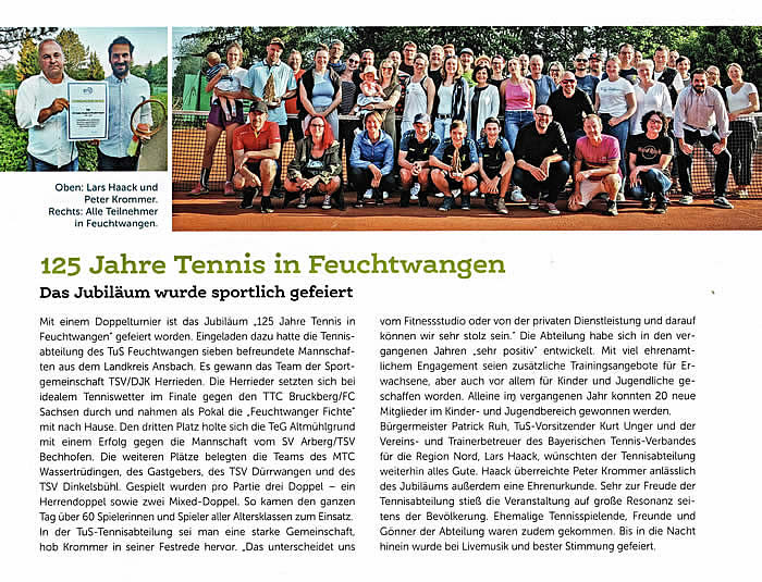 Die anschließenden Doppelbegegnungen mussten die endgültige Entscheidung bringen. Am Ende erspielten in drei sehenswerten und von allen Spielern auf hohem Nieveau geführten Doppeln die Feuchtwanger drei Siege. Im 3er-Doppel hatten Uli Peschke und Florian Krommer nur im zweiten Satz etwas zu kämpfen und bezwangen Stefan Arnold und Alexander Popp verdient. Im 1er Doppel zeigte die Paarung Libor Grznár/Daniel Rudek eine Glanzleistung und gewann den Match-Tie Break mit 10:7, was letztendlich den Gesamtsieg bedeutete. Hochklassiges und variables Doppelspiel zeigten Andreas Möller und Peter Krommer in ihrer Begegnung gegen Alexander Popp und Markus Kaiser und erkämpften den dritten Doppelsieg für die Kreuzgangstädter. Am kommenden Samstag, 13.05. treffen die Feuchtwanger bei einem weiteren Heimspiel auf den TC Neunkirchen am Brand. Ziel ist es sich mit einem weiteren Erfolg im oberen Tabellendrittel zu etablieren.