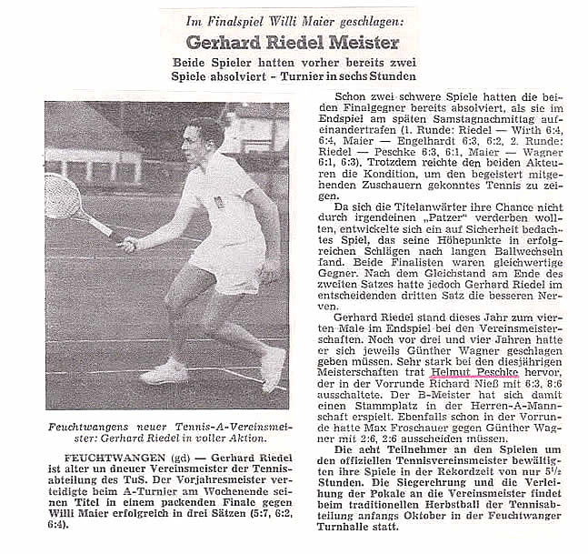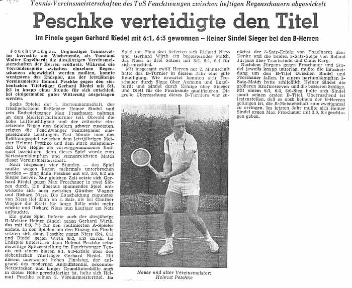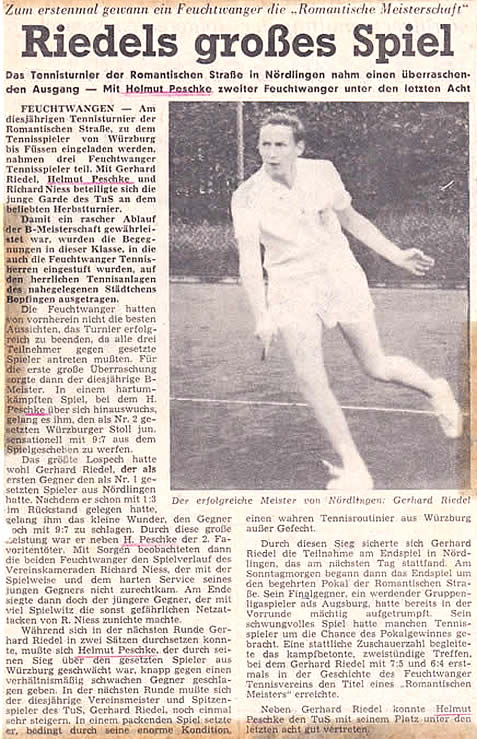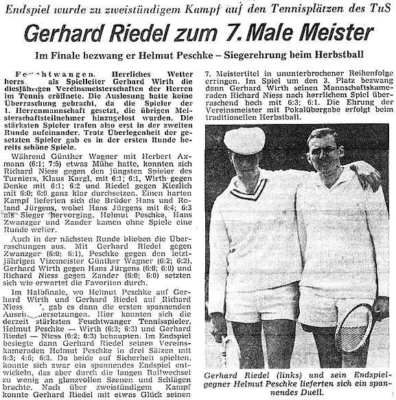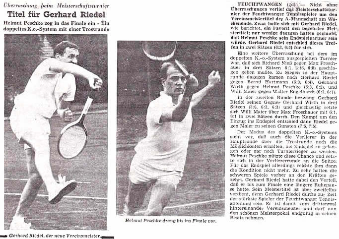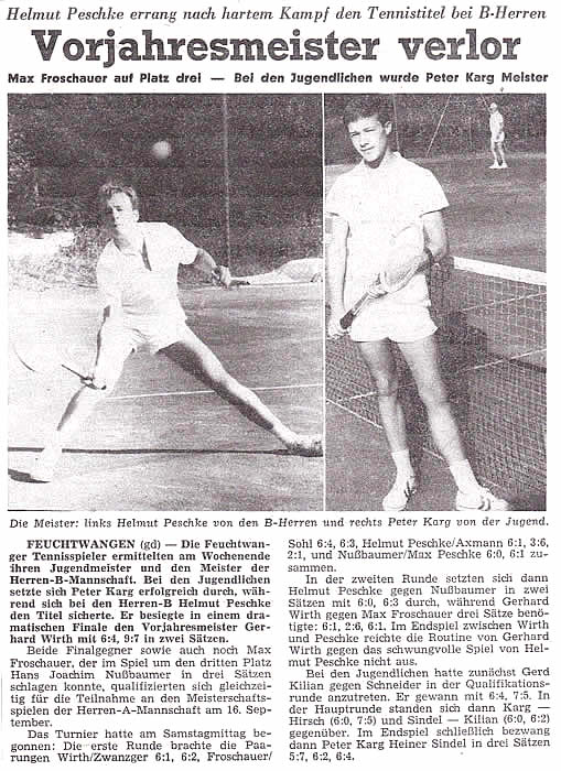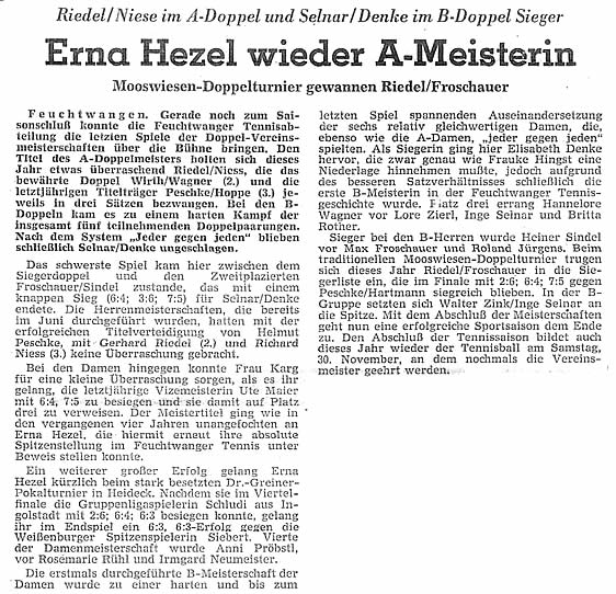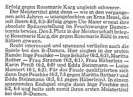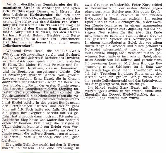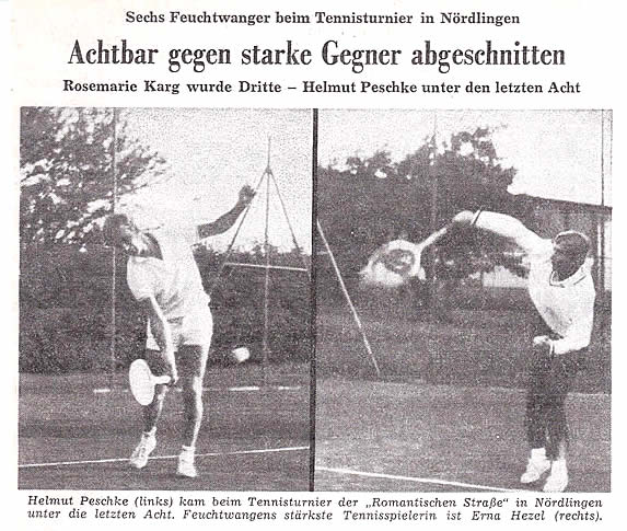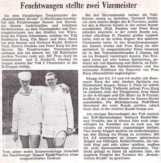 Rosemarie Karg im Dameneinzel und Gerhard Riedel/Helmut Peschke im Herrendoppel werden jeweils Vizemeister beim Tennisturnier der Romantischen Straße in Nördlingen